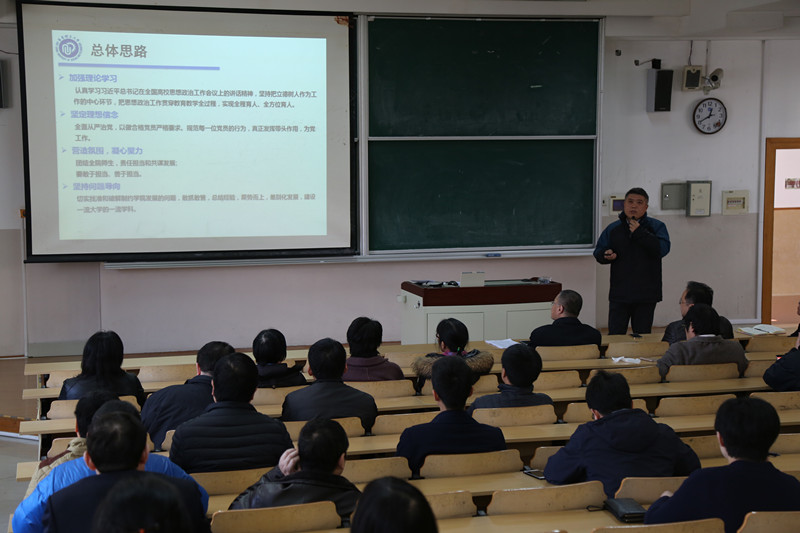 党委书记李涛首先向全体教职工传达了习近平总书记在全国高校思想政治工作会议上的讲话精神,坚持把立德树人作为中心环节,强调把思想政治工作贯穿教育教学全过程。要求学院思想政治工作的各类主体、各个系所、各门课程、各种平台、各项活动、各条制度都要做好“守好一段渠、种好责任田”,围绕立德树人根本任务同向同行。李涛还就2017年落实理论学习计划、加强党风廉政建设、“基层组织生活”特色活动年以及学院的文化建设等党建重点工作做出部署。