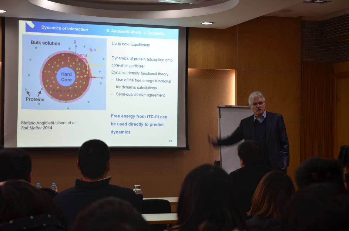 访问。Ballauff教授在实验16楼110为我院师生带来题为“Self-assembly of Proteins with Charged Polymers: Comparing experimental Data to Theory and Simulation”的学术报告(图1)。他的报告主要是关于聚电解质刷与蛋白质的相互作用,通过理论分析和计算机模拟,进一步加深了对其相互作用机理的理解。Ballauff教授丰富的知识和深入浅出的介绍,使永利博彩
