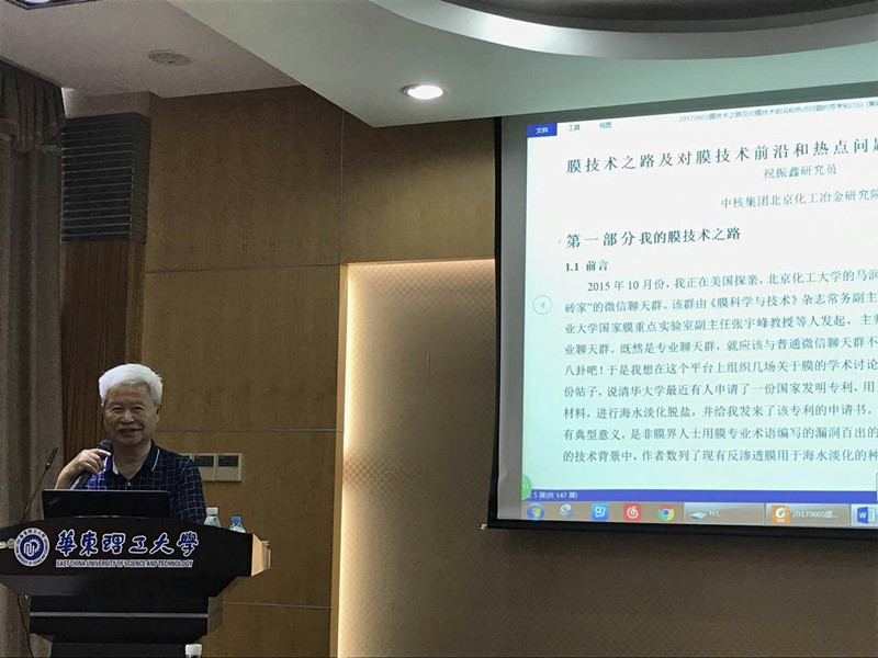 6月9日上午,中核集团北京化工冶金研究所祝振鑫研究员应邀来校访问,并在实验十六楼110室作了题为:“膜技术之路及对膜技术前沿和热点问题的思考和讨论”的学术报告。报告会由化学工程研究所所长许振良教授主持,浙江大学宁波理工学院雷引林教授、天津工业大学皇甫风云教授等教师与研究生70余人参加了报告会。祝振鑫研究员从他的出身、求学之路、工作之路和膜技术之路说起,分享了他的童年、中学和大学时代的轶事,以及工作后的心得体会,并重点讲解了他如何走上了膜技术的研发工作。同时,针对膜技术前沿和热点问题,祝振鑫研究员讲了自己的看法和观点。祝振鑫研究员风趣的讲话风格,热情洋溢的演讲感染了在场的研究生,并进行了热烈讨论与交流。此外,祝振鑫研究员与永利博彩