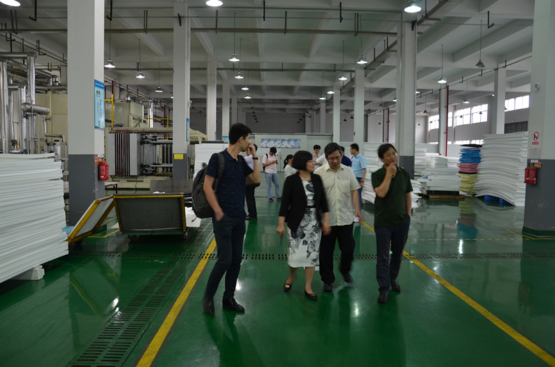 会后,部分项目专家和项目组成员一行赴浙江新恒泰新材料有限公司,现场考察了项目阶段性成果“千吨级超临界CO2模压发泡制备微孔聚丙烯片板材工业化示范装置”。