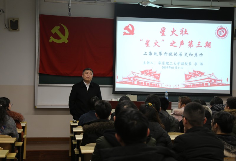 研究生骨干系列培训活动暨 “星火之声”第三期在七教101室隆重开讲。党课特别邀请到华东理工大学副校长李涛以《上海改革开放启示录》为题,给研究生党员骨干全面介绍了上海市改革开放的历史脉络,为同学们梳理出一幅“上海——时代中奋进”的蓬勃图景,给大家带来了关于学习领会海派历史中艰苦创业,曲折发展,辉煌成就的精彩一课。学院部分教工党支部党员也一起聆听的讲座。院党委副书记高艺霞主持了本次党课。