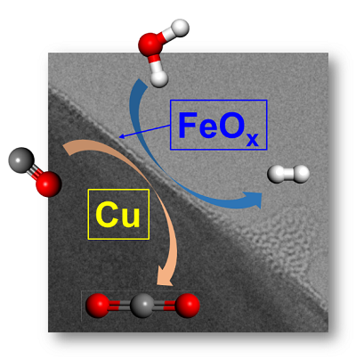 工业高温水气变换反应(CO+H2O↔CO2+H2)通常采用铁基催化剂,并加入适量氧化铬和氧化铜分别作为结构助剂与活性助剂。尽管文献中对于该催化体系的反应机理和催化剂结构已有较多报道,助剂(尤其是铜)与活性组分(氧化铁)间在微观尺度下的相互作用规律仍鲜有讨论。针对该科学问题,该团队制备了一系列负载型模型催化剂,包括CuO/Fe2O3,Fe2O3/CuO以及CuO-Fe2O3/SiO2,借助先进原位表征技术(原位XAS、原位Raman、准原位TEM、准原位HS-LEIS)发现金属铜颗粒和氧化铁之间存在金属-负载强相互作用(SMSI)。理论计算进一步表明铜-氧化铁界面具有较强的CO吸附和H2O吸附解离能力,从而表现出较高的催化活性。
