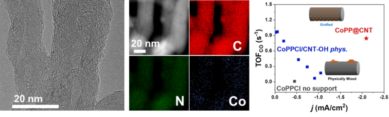 科研团队发展了一种利用共价键锚定卟啉分子的制备方法。研究人员在碳纳米管上引入羟基(-OH)、在卟啉分子轴向引入氯基(-Cl),通过取代反应将卟啉固定至碳纳米管表面。研究表明,卟啉分子与碳纳米管以共价键结合,并基本实现了单层分散,表现出极高的CO2电催化活性和CO选择性,解决了该催化体系研究中高负载量与高分散度不可兼得的难题。