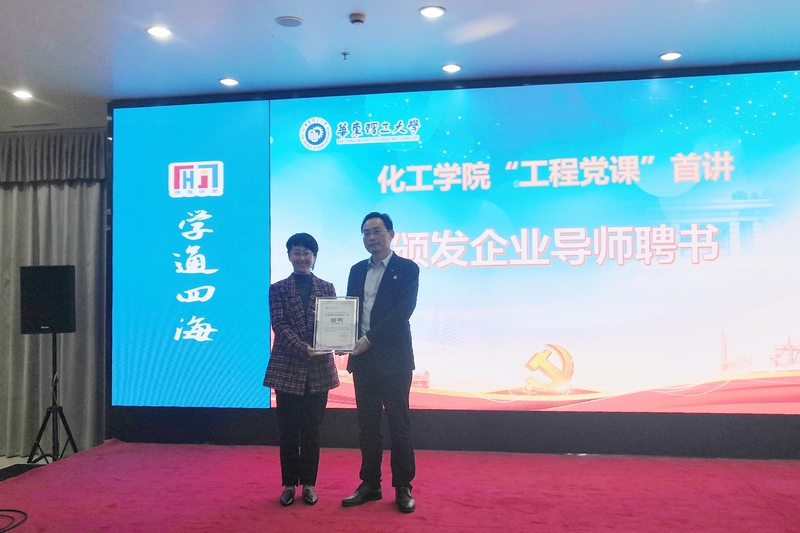 党委副书记高艺霞致辞。高艺霞介绍了“工程党课”的设计方案与重要意义,经过六个月精心筹备,形成了依托学科特色与优势,联动企业校友资源网络,汇聚社会各方力量,打造集思想引领、党性锻炼、校企合作等多元功能于一体的党建品牌。她代表学院党委感谢主讲嘉宾莅临授课,同时感谢以常青树新材料科技有限公司为代表的化工企业为“工程党课”给予的大力支持。