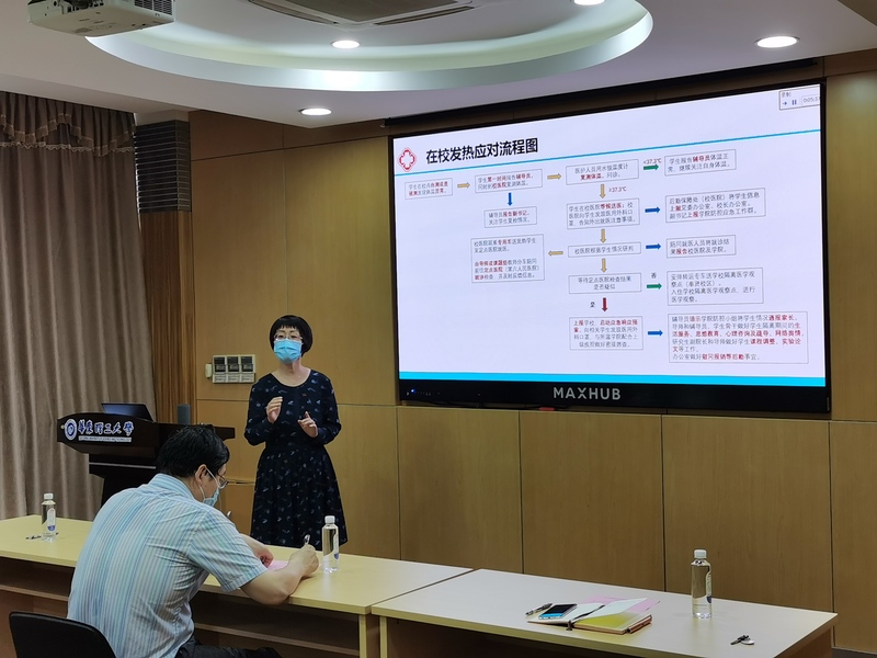 召开研究生返校疫情防控演练工作会议,研究生导师及实验室管理等相关工作人员参会,副院长刘殿华主持了会议。