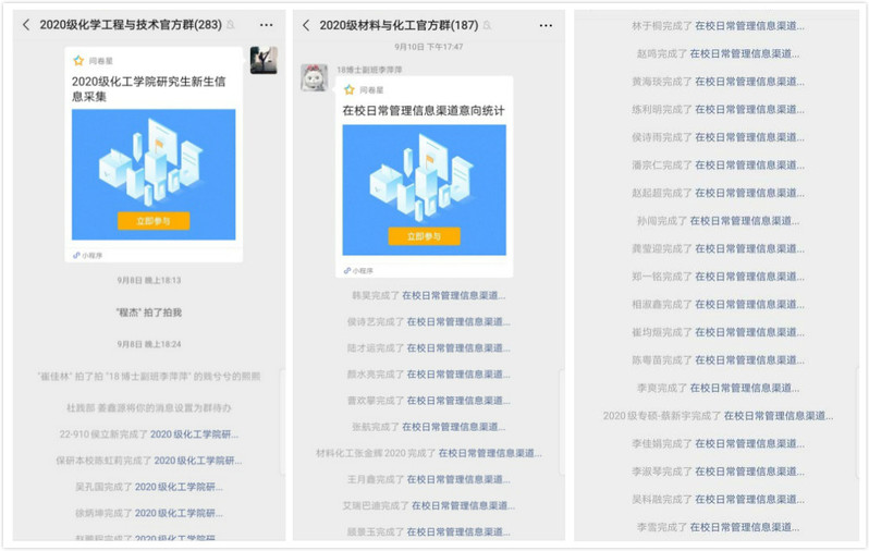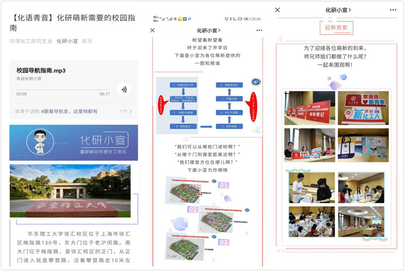 一段语音,朋辈引领。学院以化研小宣微信公众号为平台,邀请高年级研究生党员组成团队,以语音的方式传授校园生活经验;选聘高年级研究生班助,依托临时负责人建立班级群,在群内语音答疑,让新生在报到前就找到组织,以便更快适应研究生期间的学习生活。