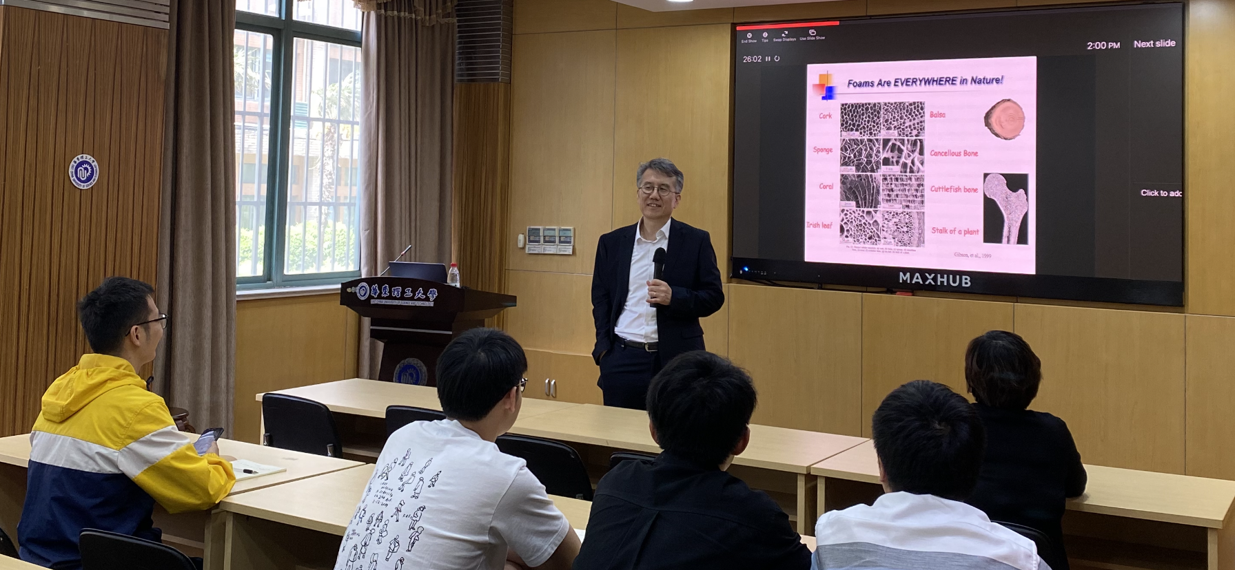 报告会上,Park教授首先概述了聚合物发泡技术的基本原理及其工业化应用进展,然后详细介绍了调控聚合物结晶性能以改善其发泡行为的相关手段,接着重点阐述了原位成纤技术的引入对聚合物发泡过程的强化机理,最后总结了聚合物结构-性能的相关性并将其应用至聚合物挤出发泡连续化生产过程。Park教授渊博的学识及幽默的演讲风格赢得了在座师生的阵阵掌声。演讲结束后,同学们就讲座内容和自己实验过程中所遇到的问题与Park教授展开了热烈的讨论。