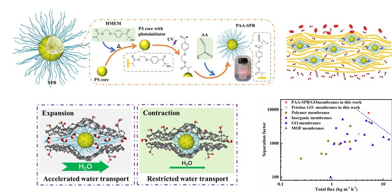分离膜与能源材料课题组,以典型的二维层状材料氧化石墨烯为研究对象,通过设计合成了一种球形聚电解质刷,并将其引入到氧化石墨烯膜的二维限域空间内,以构筑快速的水传输通道用于生物燃料的渗透汽化脱水。该研究工作以“Ultrafast Water Transport in Two-Dimensional Channels Enabled by Spherical Polyelectrolyte Brushes with Controllable Flexibility”为题,在线发表在Angewandte Chemie International Edition上。
