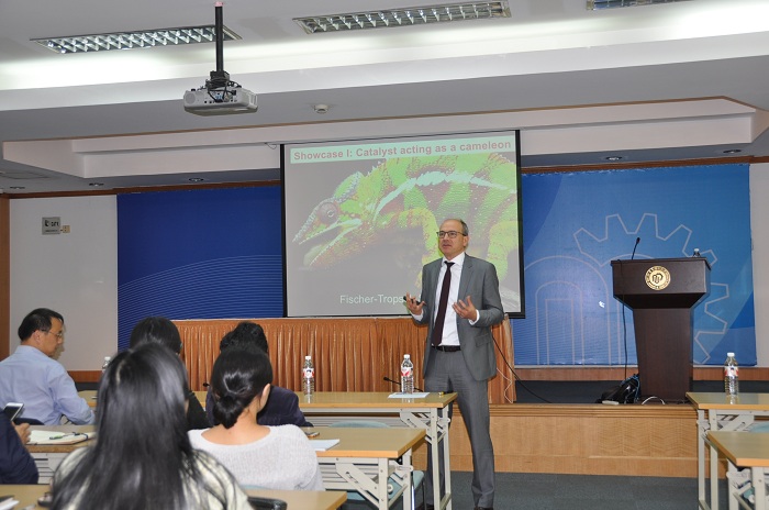 访问期间,Weckhuysen教授以他所从事的原位Operando技术为主题,为华理师生奉献了一场题为“单颗粒,分子和原子尺度下的催化材料研究”的学术讲座。讲座由韩一帆教授主持,周兴贵、刘柏平、李平、徐晶等教授出席。